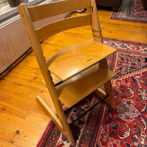 Stokke Syöttötuoli on valmistettu puusta. Se on suunniteltu lapsille ruokailuun ja istumiseen. Tuolissa on säädettävä istuin- ja jalkatuki, jotka mahdollistavat istumakorkeuden ja mukavuuden säätämisen lapsen kasvun mukaan. Käytön jälkiä löytyy ja muutamia maalitahroja, mutta täysin ehjä ja käyttökelpoinen. Vanhan mallinen.