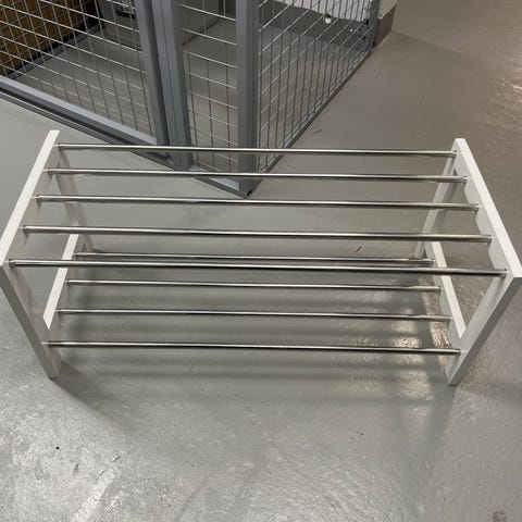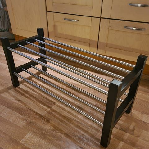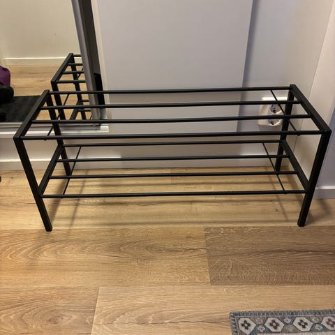 Musta, tilava, ehjä ja tukeva kenkäteline. Muutosta yli jäänyt uuteen kotiin.