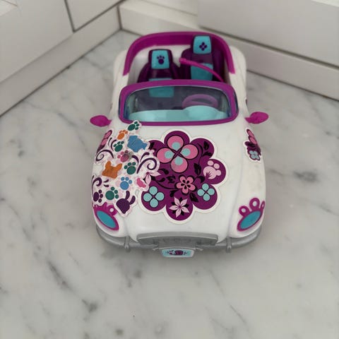 Leluauto on vaaleanpunainen avoauto, jossa on vaaleanpunaiset ja turkoosit yksityiskohdat.
