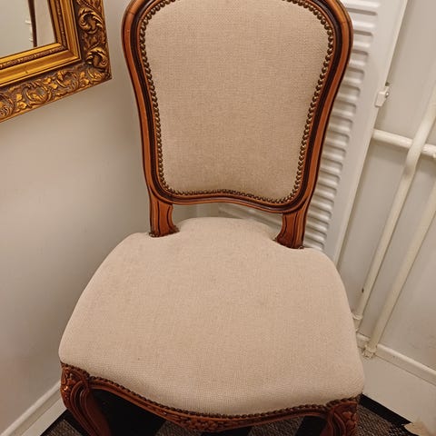 Tuoli on kevyehkö, joten kyseessä ei ole antiikki vaan myöhempi uusrokokoo-/koristetuoli.