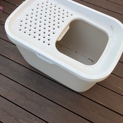 Muovinen kissanvessa, jossa sininen pohja ja valkoinen kansi. Varustettu läpinäkyvällä luukulla. 3 säkkiä eri kuiviketta. Lisäksi lapio.