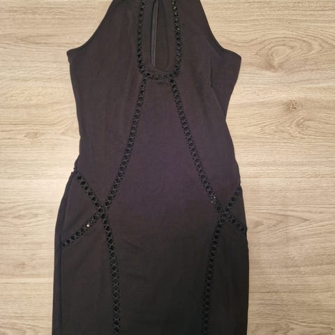 Musta mekko samettisella pinnalla kokoa S. Saa säädettyä pituutta edessä olevilla naruilla lisäämällä tai vähentämällä rypytystä. Muutamasti käytetty.
