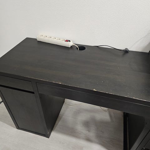 Ikea Micke työpöytä. Vihreä laatikko on vedetty siististi hopeisella dc-fixillä. Pinnassa muutama jälki.