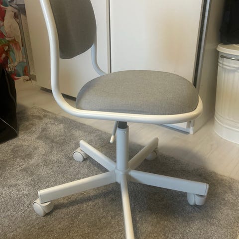 IKEA lasten tuoli, jossa on säädettävä korkeus. Tuolin istuin ja selkänoja ovat puuta, jalusta on harmaa metallia. Naarmuja istuimen sivuissa ja takana selkänojan alla. Pitää putsata.