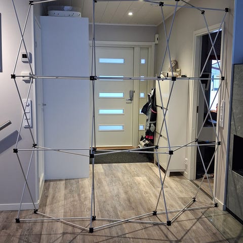 Messuille ja tapahtumiin pop-up seinä / messuseinä / mainosseinä suora joka on ollut pari kertaa vain käytössä. Paketissa 4 kpl messuseinän halogeenivaloja , joita ei ole käytetty kertaakaan. Kuljetuslaukku renkailla + vetokahvalla + kantohihnat. Teetät vain oman yrityksen mainoskankaan jossa on tarranauhan vastapuoli. Tämä messuseinä ei ole rimpula seinä. Nopea pistää pystyyn ja takaisin kasaan.