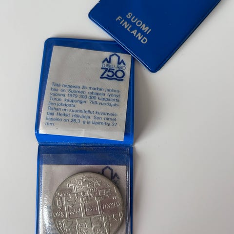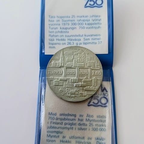 Heikki Häiväoja suunnittelema Turku 750 vuotta juhlaraha, nimellisarvo 25 markkaa. Kolikon materiaali on 500 promillea hopeaa, paino 26,3 grammaa ja halkaisija 37,00 mm. Kolikon kääntöpuolella on kuvio, joka esittää kaloja, ja se liittyy Aurajoen suhdanteeseen. Lyöntimäärä 300 000 kappaletta. Mukaan tulee alkuperäinen muovitasku ja dokumentti.