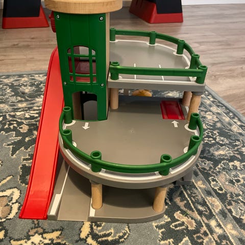 BRIO lasten parkkitalo, jossa on useita tasoja, ramppi ja hissi. Siisti ja hyvässä kunnossa, paitsi yksi nipukka irronnut.