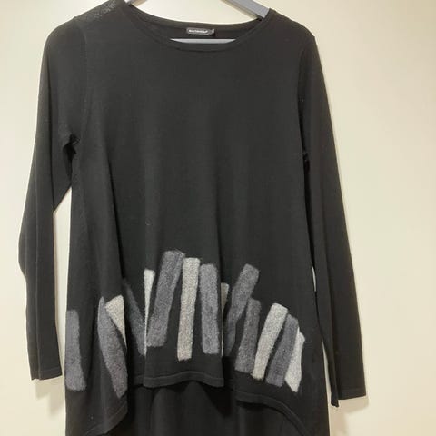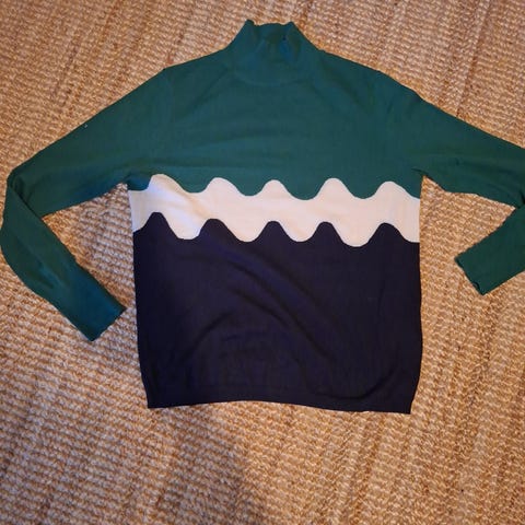 Marimekon ohut villaneule koko M, leveys 60cm ja pituus 48cm. Neuletta on pidetty, siisti, ei pesty, tuuletettu, helman resori hieman löystynyt.
