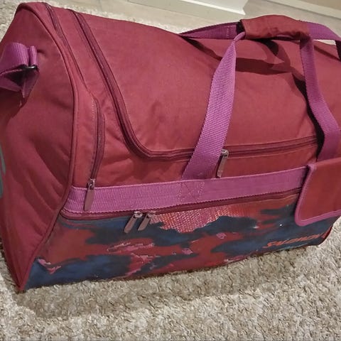 Mitat n. 80 cm x 40 cm x 30 cm., sisällä kaksi osastoa, vetoketjut hyvässä kunnossa.