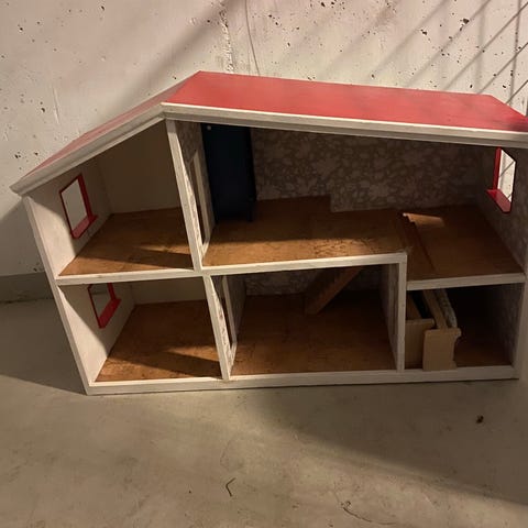 Annetaan paljon elämää nähnyt nukkekoti, mutta ihan käypä leikkeihin. Sisällä olevista huonekaluista voidaan neuvotella.