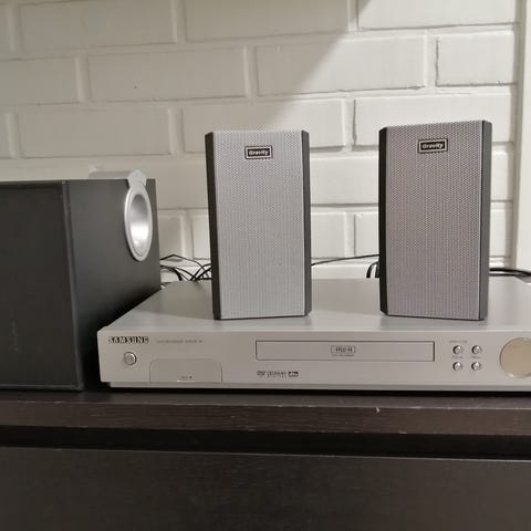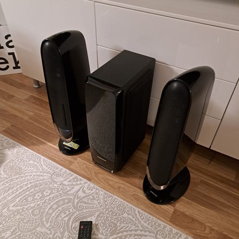 Sansung kotiteatterilaitteisto HT-TZ315. Mukana bassokaiutin, keskikaiutin ja neljä tolppakaiutinta sekä langaton lähetin kahdelle kaiuttimelle sekä vastaanotin laitteistoon. Laite on ollut CD käytössä, joten dvd ominaisuuksista en osaa sanoa. CD soitin on vähän ranttu, ei soita kaikkia CD levyjä ja jostakin syystä välillä pätkii soittoa, muutoin toimii kuten pitääkin. En myy kauittimia erikseen, kaikki tai ei mitään. En toimita, vain nouto. Hinta pyydetyn mukainen, voi tarjotakin.