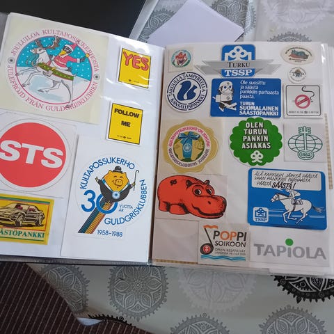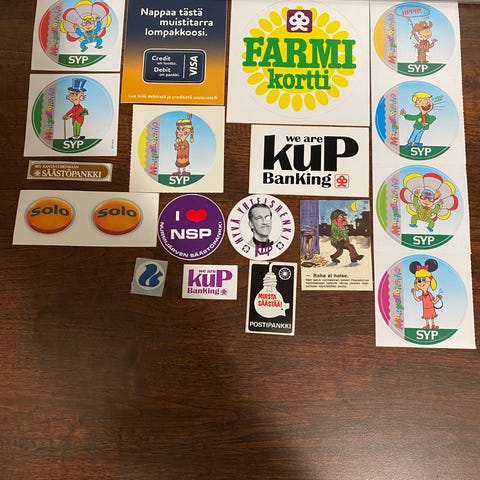 38 vanhaa ja siistikuntoista pankkiaiheista tarraa.