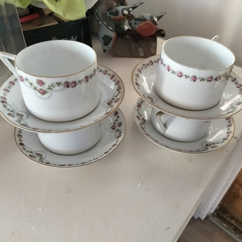 4 kpl sinisiä kuppeja ja asetit.