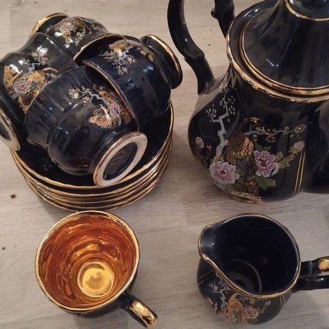 36 kpl harmaita kuppeja ja asetit.