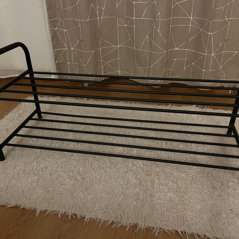 Hyllyssä on metallirunko ja useita tasoja kenkien säilytykseen. Sopii eteiseen tai muuhun tilaan. Kuvassa olevat naulakon paikat itsellä ei ole kiinnitettynä.
