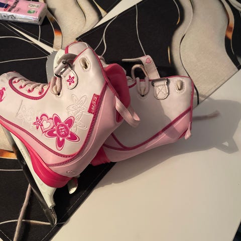 Revolution Lasten säädettävät luistimet koko 33-36 ja pinkit glitter terän suojat.