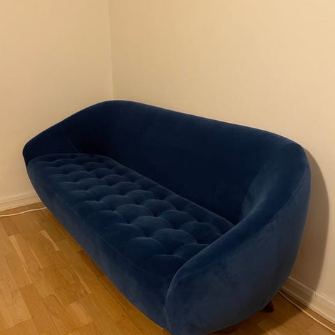 Kolmen istuttava sohva sinisellä samettikankaalla. Sohvassa on pehmustetut istuimet ja selkänojat, jotka tarjoavat mukavuutta. Sopii olohuoneeseen tai muuhun oleskelutilaan.