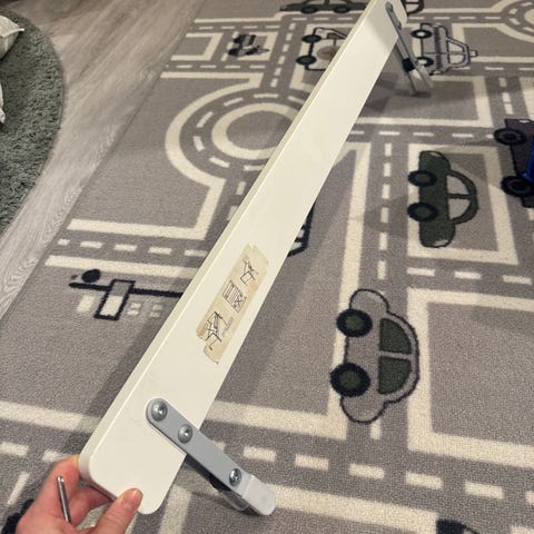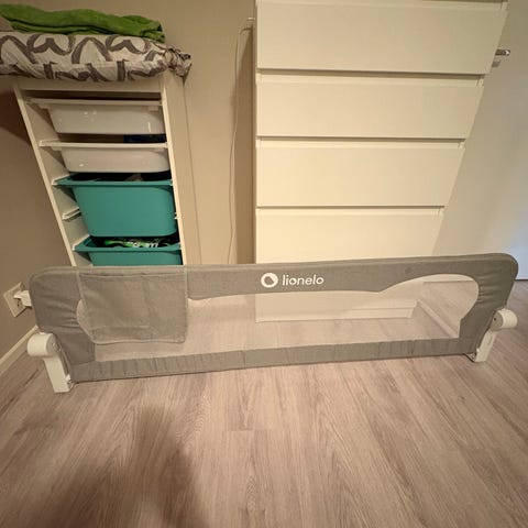Sängyn turvakaide mustalla kankaalla ja valkoisilla kiinnikkeillä. Turvakaide on suunniteltu estämään lapsen putoaminen sängystä. Sopii käytettäväksi erilaisissa sängyissä, valkoiset tuet työnnetään patjan alle.