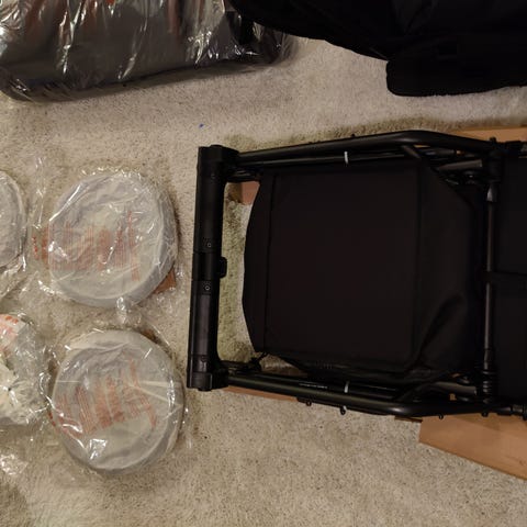 Mukana: Istuinosa, vaunukoppa (molemmat helposti asennettavissa kahteen suuntaan), ratasosan jalkapeite, sadesuoja, hyönteissuoja, sekä adapterit turvakaukalon kiinnitystä varten.