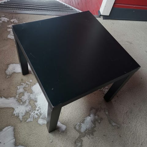 Annetaan Veken tukeva sohvapöytä muuton alta. Kansi kivijäljitelmää ja jalat metallia.