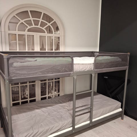 IKEA kerrossänky, metallirunkoinen, soveltuu tilan säästämiseen ja lasten tai nuorten käyttöön. Sänky on suunniteltu kestävällä metallikehyksellä ja siinä on tikkaat yläpetiin pääsyä varten. Patjan saa halutessaan mukaan, mutta on jo kulahtanut.