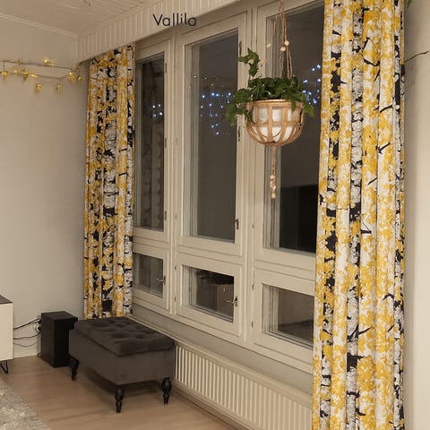 Vallilan verhot, 2 kpl, valmistettu puuvillasta. Verhossa on värikäs kuosi, jossa on erilaisia kasvi- ja kukka-aiheisia kuvioita. Sopii kodin sisustukseen.