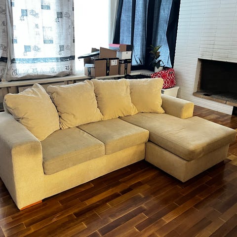 Jämäkkä sohva. Istuinosat, selkänoja ja käsinojat nahkaa. Saa kahteen osaan. Muutama jälki on.