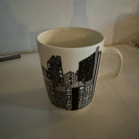 Muki, jossa punainen pohjaväri ja valkoiset tähtikuvioinnit. Materiaali posliinia. EI OLE MARIMEKKO, En pystynyt poistaa, Martinex