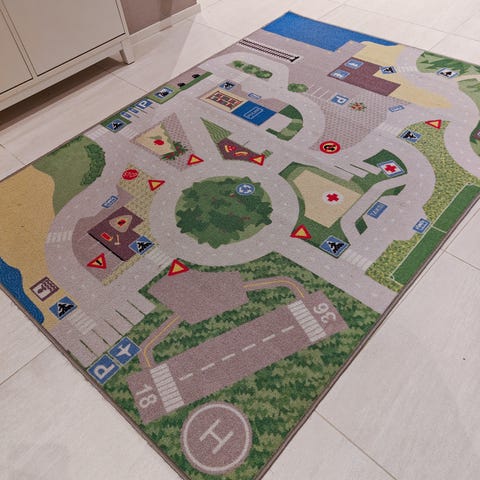 H&M Home lastenmatto, jossa kaupunkikuvio. Matto on harmaasävyinen ja esittää katuja ja taloja. Sopii lastenhuoneeseen leikki- ja sisustus käyttöön. Kaksi pientä haalea tahraa, näyttää piipusta tulevan savua :) nouto Porvoo tai Loviisa, postitus onnistuu myös, s pakettina.