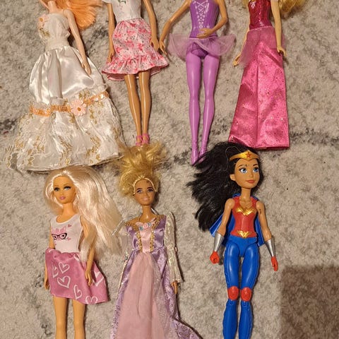 Kolme nukkea ja hevonen. Kunto ihan hyvä. Tukat voi olla hiukan takussa ja keijun siivet ovat taittuneet useammasta kohdasta.
