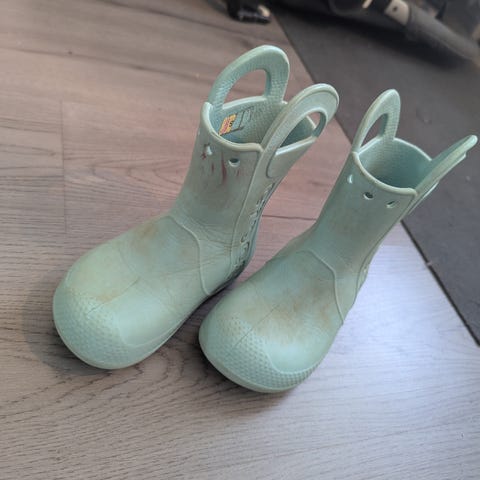 Crocs lasten kumisaappaat, koko 25 (C 9) Vihreät unisex-malliset saappaat, joissa kädensijat helpottavat pukemista. Pohjassa karkea kuviointi, joka lisää pitoa liukkailla alustoilla. Soveltuvat lapsille ulkoleikkeihin ja sateiselle säälle.