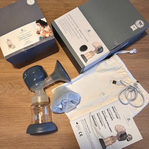 Pumpun lisäksi hintaan sisältyy pakkaus maidonsäilytyspusseja (20 kpl) ja adapteri, pakkaus rintasuppiloita (2 kpl) ja joitakin käyttämättömiä varaosia pakkauksessaan. Lisäksi avaamaton pakkaus pullon tutteja (2kpl). Tuttipullon ehdin jo heittää pois, kaikki muut alkuperäiset osat tulevat pumpun mukana. Latauskaapeli on hukassa…
