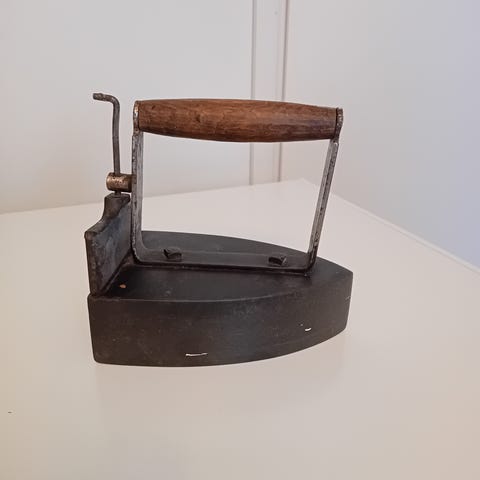 Vanha silitysrauta, 2 x puiset kenkälestit, vanha avain.