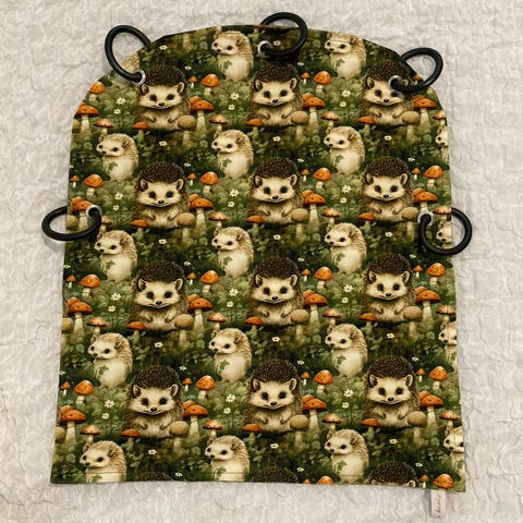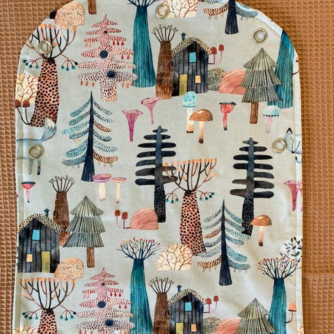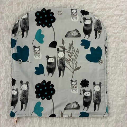 Trikoosta ommeltu värikkäitä vauvan vaunuverhoja.