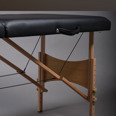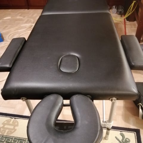 Valkoinen taitettava hierontapöytä, jossa on kasvoaukko. Pöydän jalat ovat metallia. Kuvissa näkyvissä pieniä vaurioita hoitopöydän nahan (keinonahan? tai muu helppohoitoinen materiaali) pinnassa.