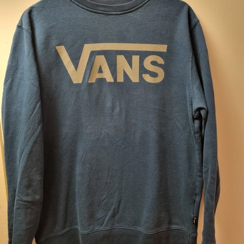 Myynnissä vihreä Vansin collegepaita. Paita on ollut aktiivisessa käytössä useiden vuosien ajan, joten siinä on selkeää käytön jälkeä. Kangas on hieman nukkaantunut ja väri on ajan myötä haalistunut, kuten kuvista näkyy.