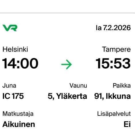 La 14.2.2026. IC 175 Helsinki–Tampere. Lähtö klo 14:00, saapuminen klo 15:53. Vaunu 5, alakerta, ikkunapaikka 49.