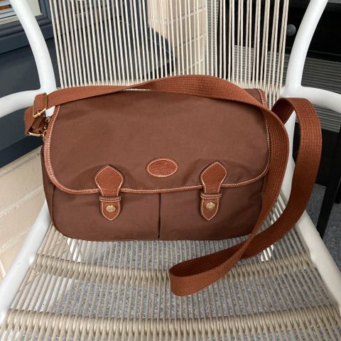 Elämää nähnyt crossbody etsii uutta kotia. Laukku on pehmeää nahkaa, jossa leopardikuvioinen vuori. Laukussa on kullanväriset niitit ja ketjua olkahihnassa. Laukku on pehmeä, ei siis pysy pystyssä, ei sisällä mitään kovikkeita. Mutta se taitaa olla laukun juttukin eli on rento. Laukussa on käytön jälkiä ja kullanväriset ketjut ovat himmenneet. Vuori ehjä ja siisti. Korkeus noin 23 cm ja leveys noin 26 cm. Olkahihnan pituus noin 123 cm. Kauppaan kuuluu Longchampin dustbag.