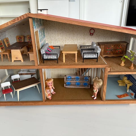 Osa kalusteista rikkoutuneita. Nukeilta irronneet jalat. Aitoa 70.l arvostaville. Retroa. Kaupan päälle leikki koiran kanto boxi ja pari lelu koiraa.