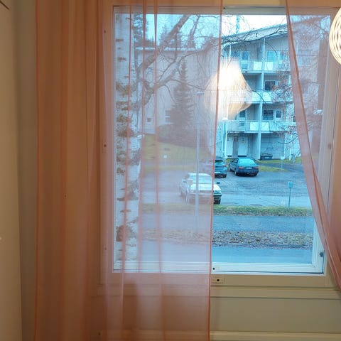 Lilan/violetin väriset pitkät verhot, joita on kaksi kappaletta. Ei tankokujaa. Haku Joutsenon keskustasta