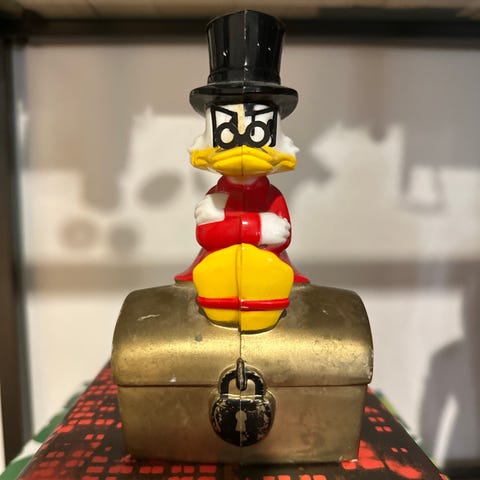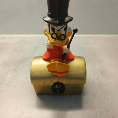 Roope Ankan rahasäiliö sangen harvinaisessa kuparin värissä. Visukintulla kakkulat silmillä ja keppi kourassa - kuten vanhalla herralla kuuluukin! Ehjä, siisti kunto. Arkussa hentoisia jälkiä, näkyy kuvissa.