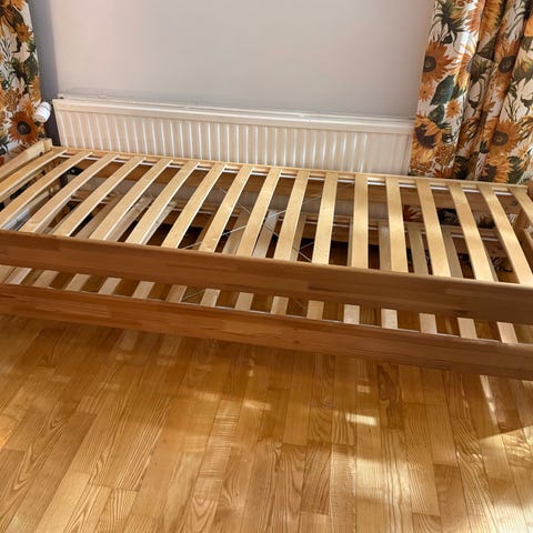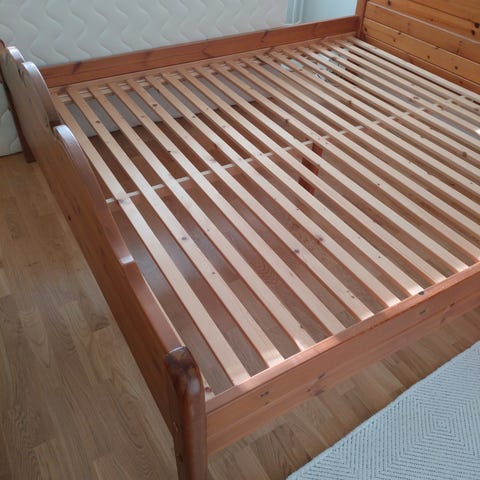 Myydään tukeva ja siisti puinen parisängyn runko. Mukana sälepohja.