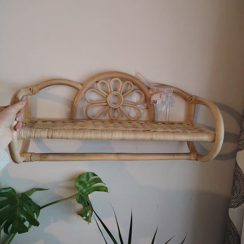 Pieni rottinkihylly, mitat n. 55x40x20. Saa taitettua kasaan, voi ripustaa seinälle tai pitää tason päällä.