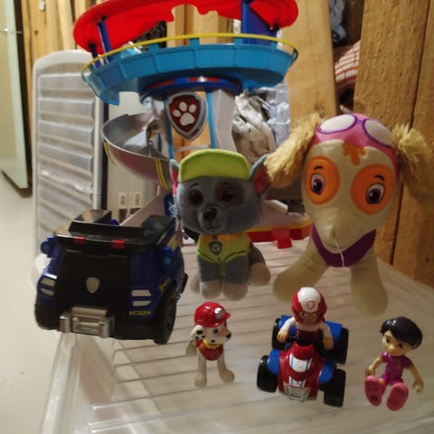Paw patrol kassi yli puolillaan suklaamunista saatuja leluja ja pari kolme pikkuautoa. En takaa että kaikissa on osat tallessa.