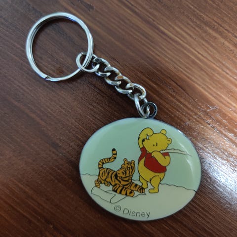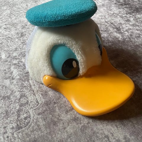 Disney Donald Duck avaimenperä sinisellä nauhalla, jossa teksti "Follow me this way" ja apilan kuva. Avainlenkki on kiinnitetty pieneen Donald Duck -hahmoon, joka on sinivalkoinen ja keltainen.