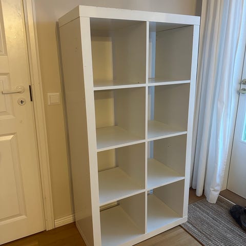 Valkoinen IKEA - KALLAX- hyllykkö laatikoilla, kuvasta puuttuu 3 laatikkoa mutta ne saa tietysti mukaan!