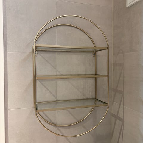 Mustarunkoinen lasihyllykkö, jossa useita tasoja. Sopii kylpyhuoneeseen.