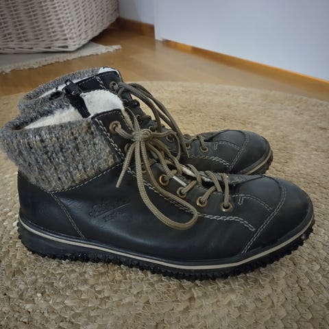 Rieker talvikengät, koko 38. Ruskeat nahkaiset talvikengät, joissa nauhakiinnitys ja vetoketju sivussa. Kengissä kulutuspohjat ja koristeompeleet.