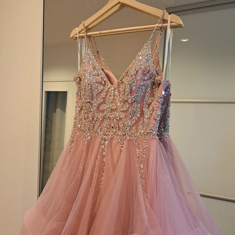 Korallinpunainen olkaimeton vanhojentanssimekko, koko 36, ostettu Zazabellasta ja kerran pidetty.
