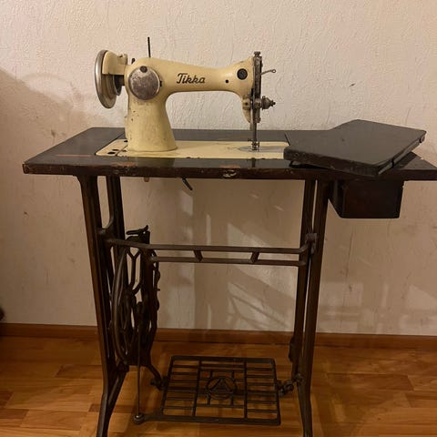 Vanha ruskea ompelukone pöytä. Kone epäkunnossa ja ruosteinen. Vain nouto.